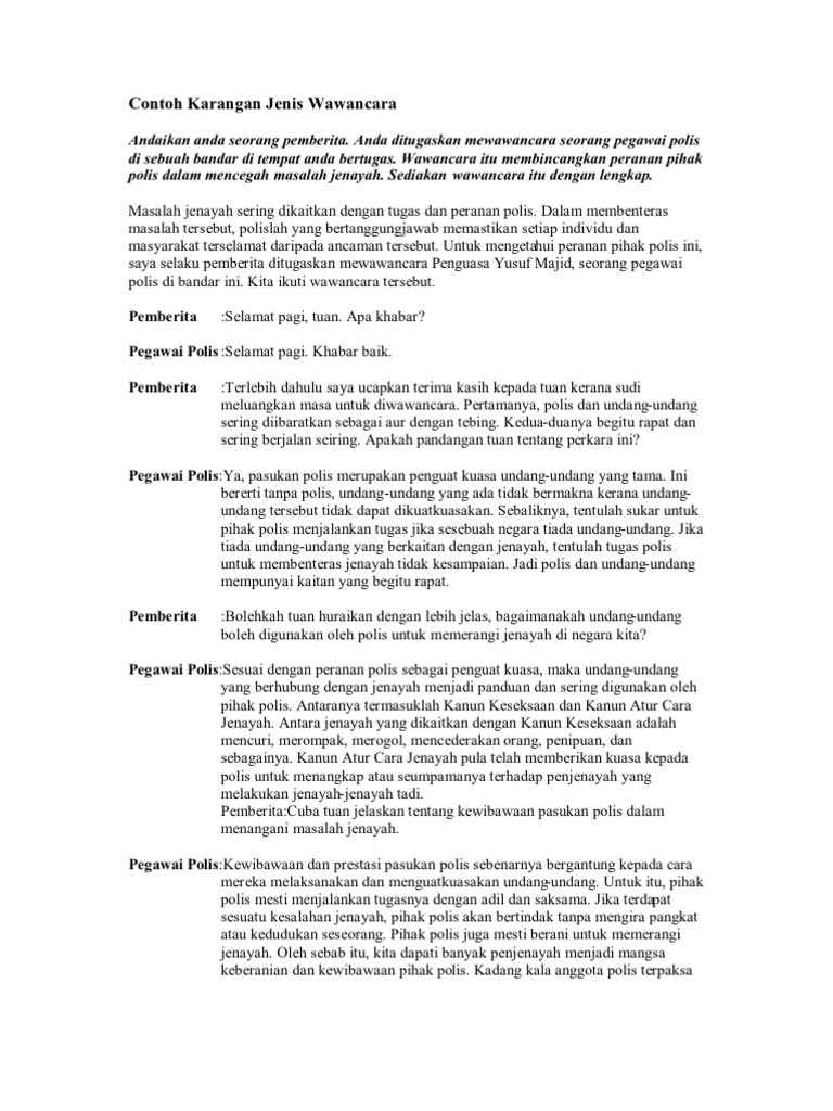 Contoh Karangan Wawancara Pt3. Adapun tahap-tahap wawancara yang diantaranya yaitu. Anda ditugaskan mewawancara seorang pegawai polis di sebuah bandar di tempat anda bertugas.